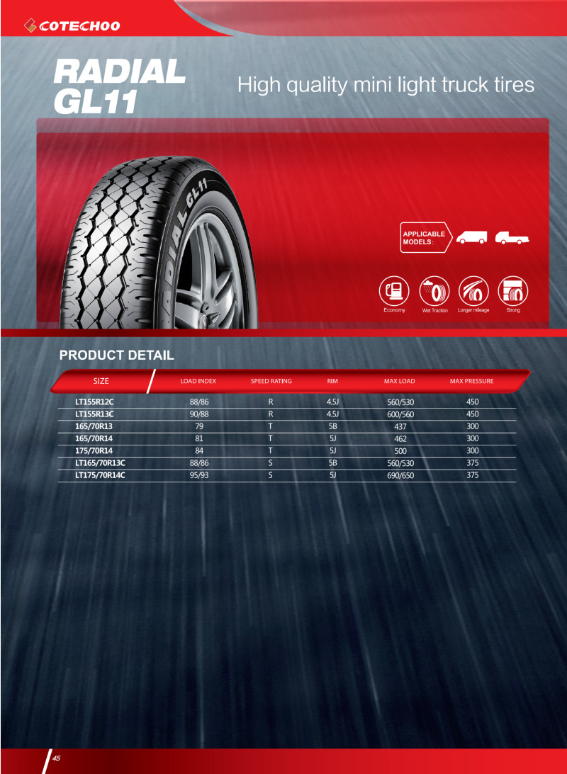 精品輕載輪胎,高強胎體結構,承載力更強,耐磨橡膠配方和加深花紋,更高的使用壽命。