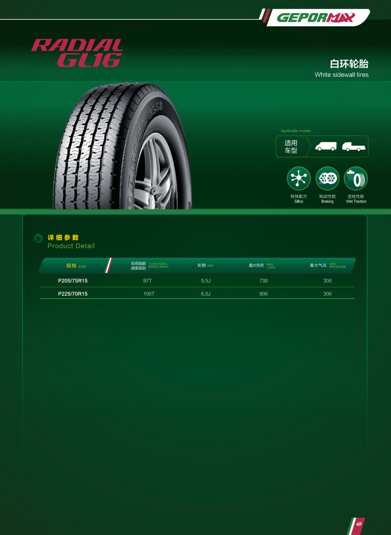 胎側(cè)白環(huán)裝飾,汽車行駛更受矚目,獨特花紋設(shè)計,具有良好的排水性能和制動力