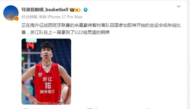 如今根據(jù)媒體人導(dǎo)演我躺哪_basketball報(bào)道:“正在海外征戰(zhàn)西班牙聯(lián)賽的余嘉豪將暫時(shí)離隊(duì)回國(guó)參加即將開始的全運(yùn)會(huì)成年組比賽,浙江隊(duì)在上一屆拿到U22組男籃的銅牌。”