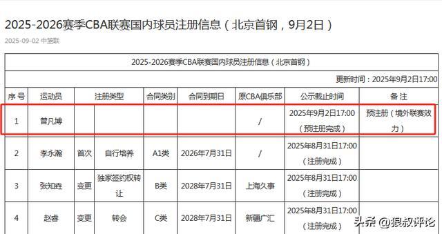 從目前的處境來看,曾凡博沒有足夠健康的身體狀態(tài),繼續(xù)沖擊NBA希望不大的情況下,返回CBA聯(lián)賽概率是相對比較大于其他可能性。原因比較簡單,北京男籃已經(jīng)對曾凡博進(jìn)行了預(yù)注冊,25-26賽季12月份才正式開打。