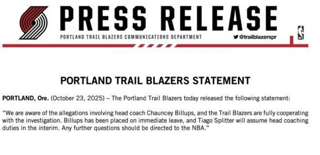“我們已知曉有關(guān)主教練昌西·比盧普斯的指控,波特蘭開(kāi)拓者正全力配合調(diào)查,”球隊(duì)在聲明中表示,“ 比盧普斯即日起暫停職務(wù),臨時(shí)主教練一職將由斯普利特暫代,所有后續(xù)進(jìn)展將由NBA統(tǒng)一處理。”