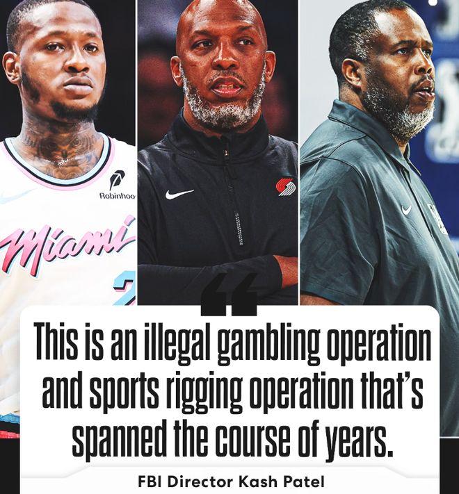 不過(guò),楊瀚森首秀雖然打得艱難,但更艱難的還是賽后消息。據(jù)美媒ESPN的最新消息,F(xiàn)BI在近日的一場(chǎng)突擊行動(dòng)中,揭開(kāi)了NBA近年來(lái)最大的涉賭丑聞——波特蘭開(kāi)拓者隊(duì)主教練昌西·比盧普斯、邁阿密熱火隊(duì)后衛(wèi)特里·羅齊爾與前NBA球員達(dá)蒙·瓊斯被逮捕,一場(chǎng)波及全聯(lián)盟、涉及多達(dá)31人的非法賭博網(wǎng)絡(luò)浮出水面。