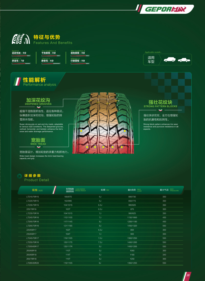 高性能越野輪胎,強壯花紋塊和胎體,能適應(yīng)各種惡劣路況。
