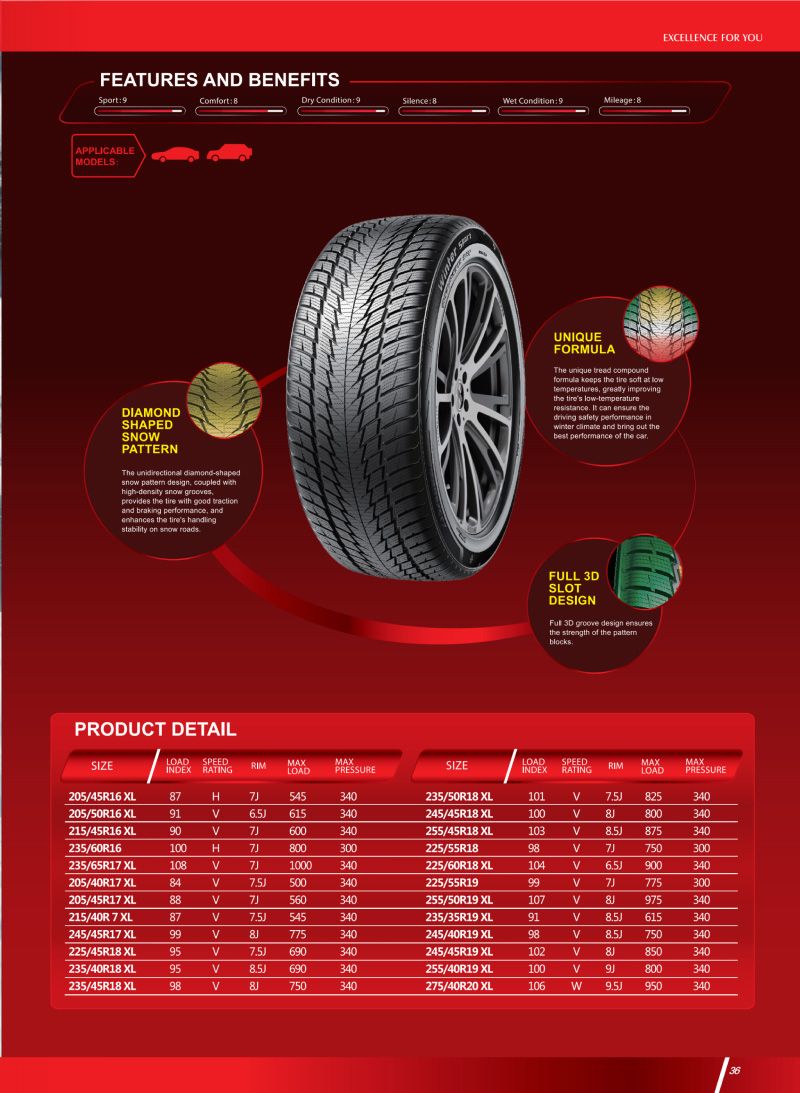 獨(dú)特胎面膠料配方及花紋,為輪胎提供良好的牽引力和制動性能,可保證在冬季氣候下的駕駛安全性能。